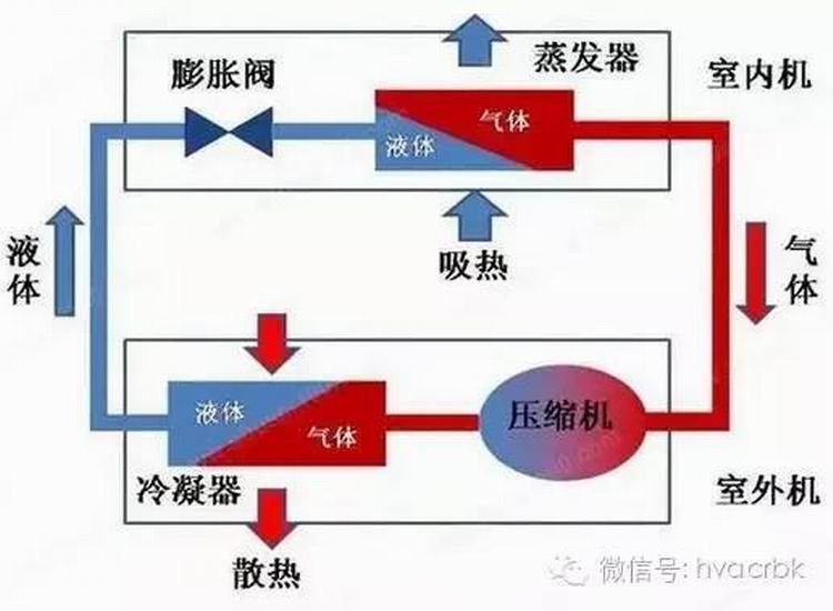 制熱的時候有一個叫四通閥的部件,使冷媒在冷凝器與蒸發(fā)器的流動方向與制冷時相反,所以制熱的時候室外吹的是冷風(fēng),室內(nèi)機(jī)吹的是熱風(fēng)。其實(shí)就是用的初中物理里學(xué)到的液化(由氣體變?yōu)橐簯B(tài))時要排出熱量和汽化(由液體變?yōu)闅怏w)時要吸收熱量的原理。